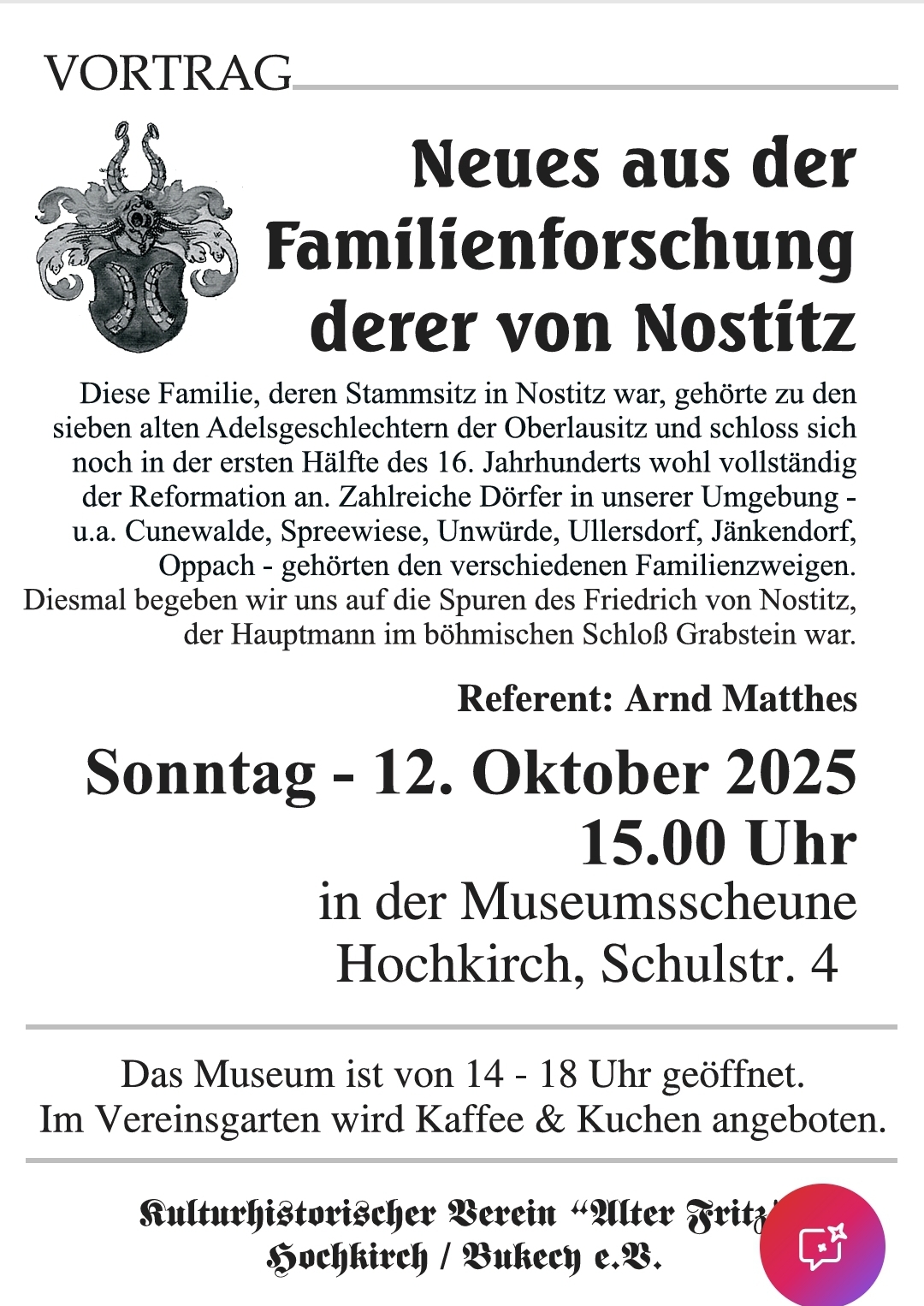 • 15:00 – Neues von der Familienforschung derer von Nostitz Referent: Arnd Matthes aus Waditz